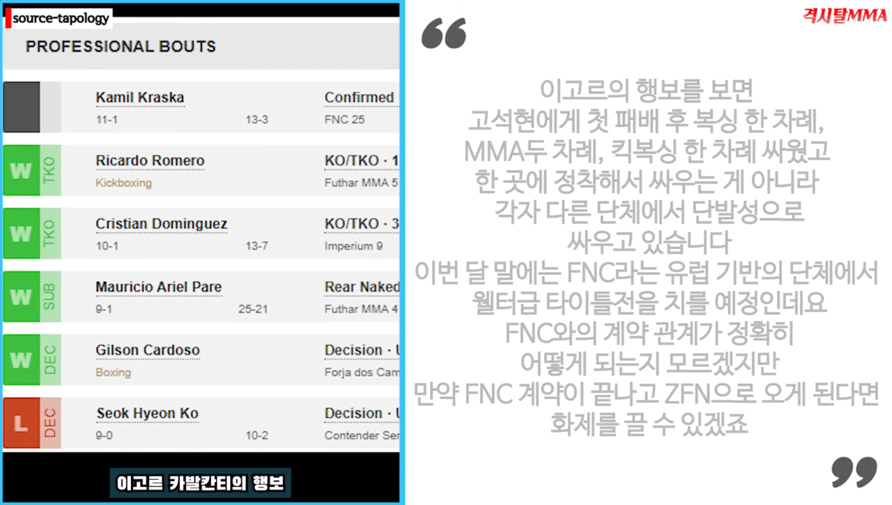 현재 전적 11승 1패(고석현)  고석현 패배 이후 4연승중