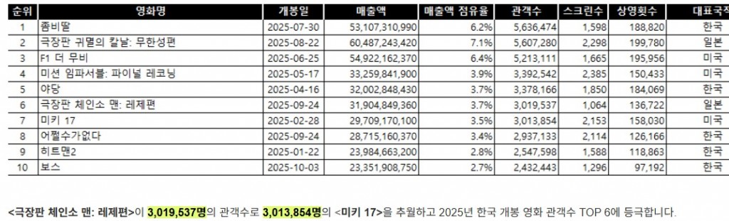 5위: 극장판 체인소 맨: 레제편(301만,진행중)