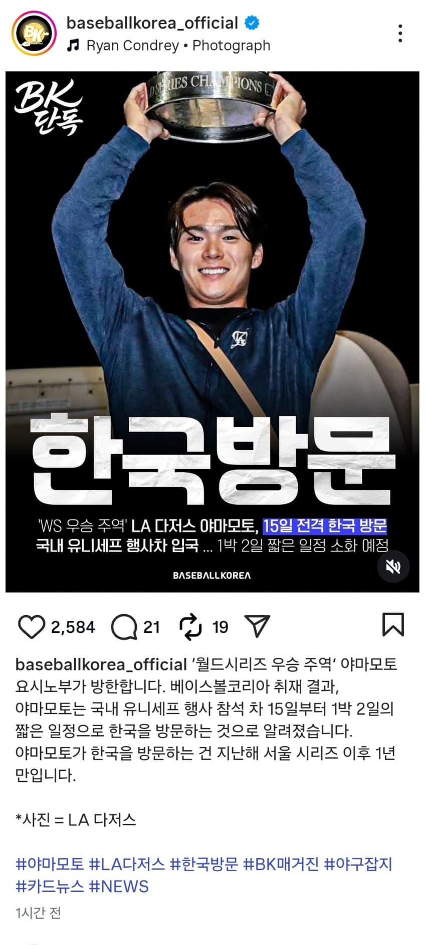 MLB 월드시리즈 MVP 야마모토 요시노부 한국 방문 예정