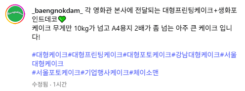 각 영화관 본사에 전달되는 대형프린팅 레제편 케이크