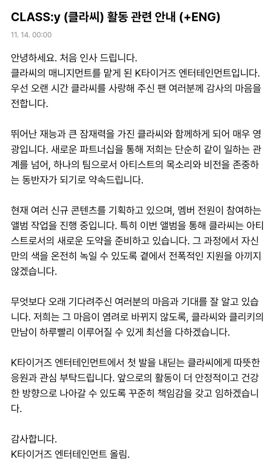 걸그룹 클라씨 소속사 옮김 공지