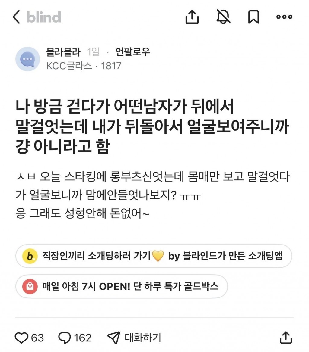 걷다가 남자가 말걸었는데 뒤돌아서 얼굴보여주니까