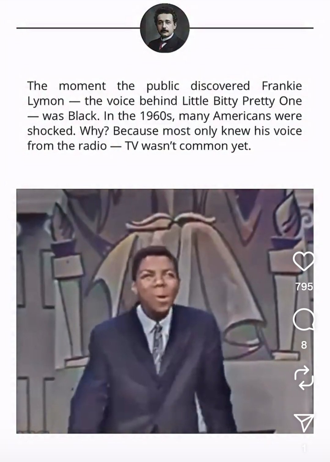 해당 영상은 1958년부터 1960년까지 방영된 "The Dick Clark Show"란 TV 프로그램의 한 장면으로 흑인 가수 프랭키 라이몬이 출연해 Little Bitty Pretty One란 곡을 부르는 모습이다.