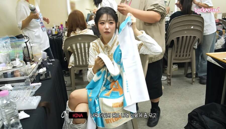 메이크업을 막 끝내고 나온 히나. 그 뒤를 이어 메인보컬 이시연양이 메이크업을 받고 있다.