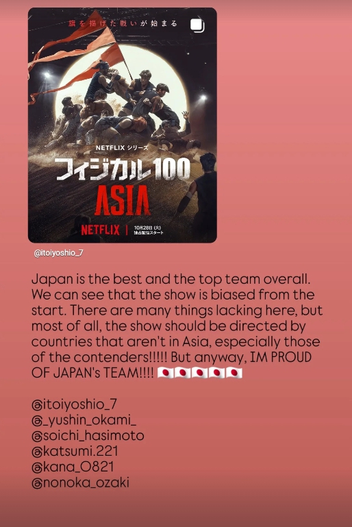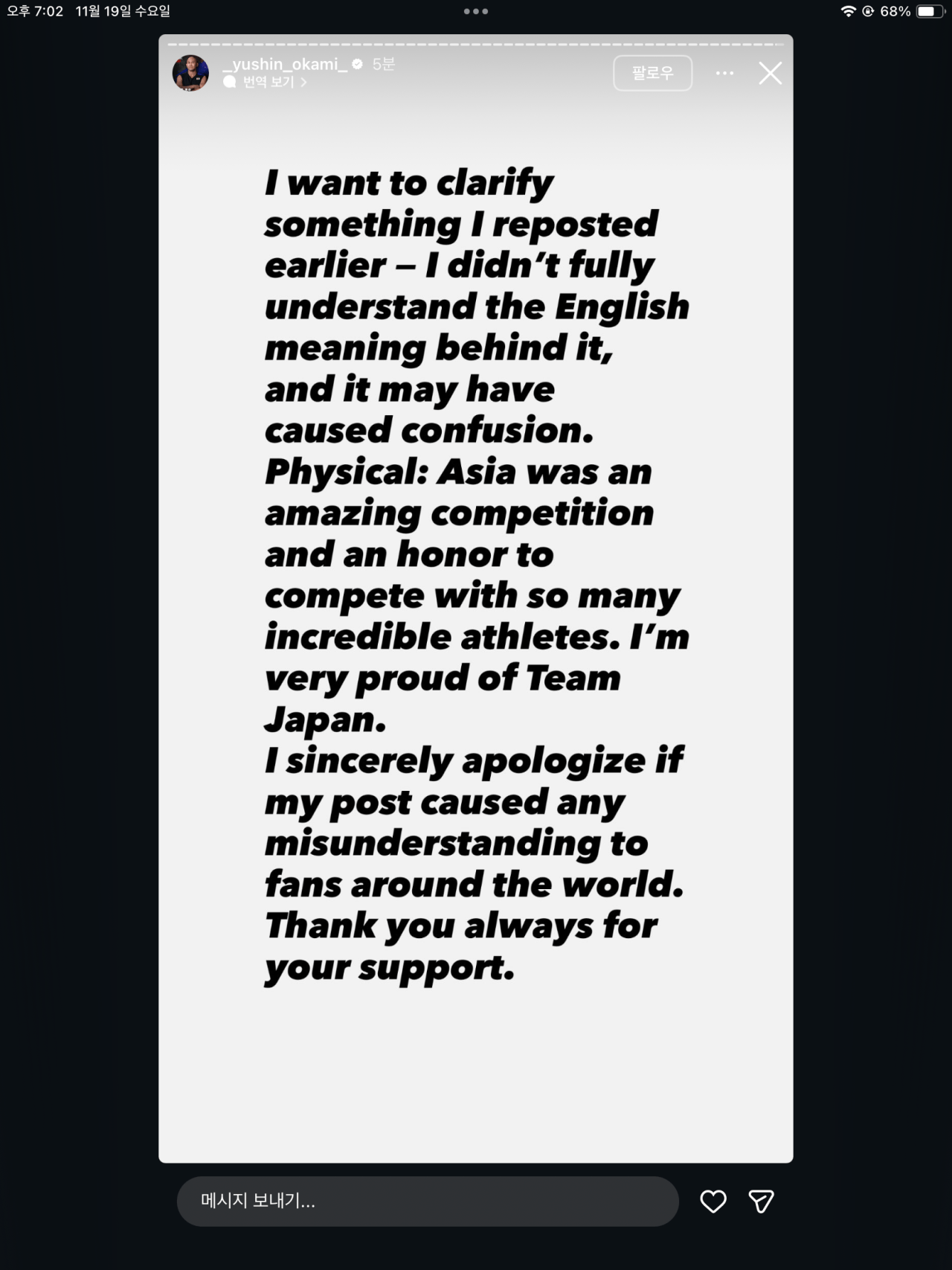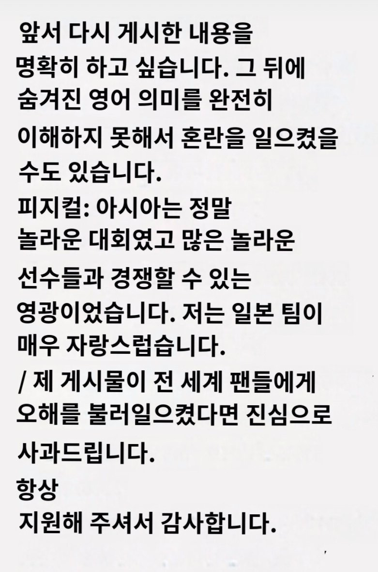 "피지컬 아시아" 일본 출연자 인스타 사과문