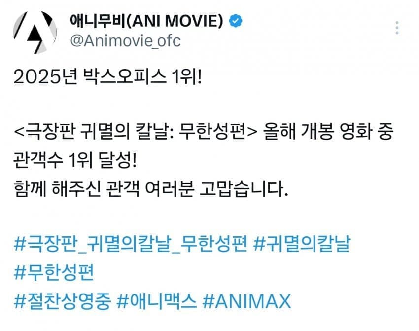 귀멸의 칼날 무한성편 한국 2025년 박스오피스 1위