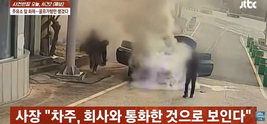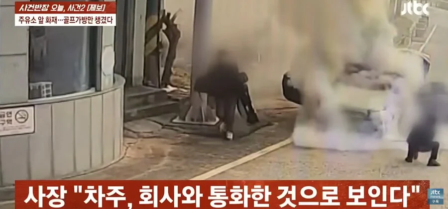 차주는 골프 가방만 챙기고 튐. 주유소 주인이 급하게 나와서 소화기로 진화 시도함.