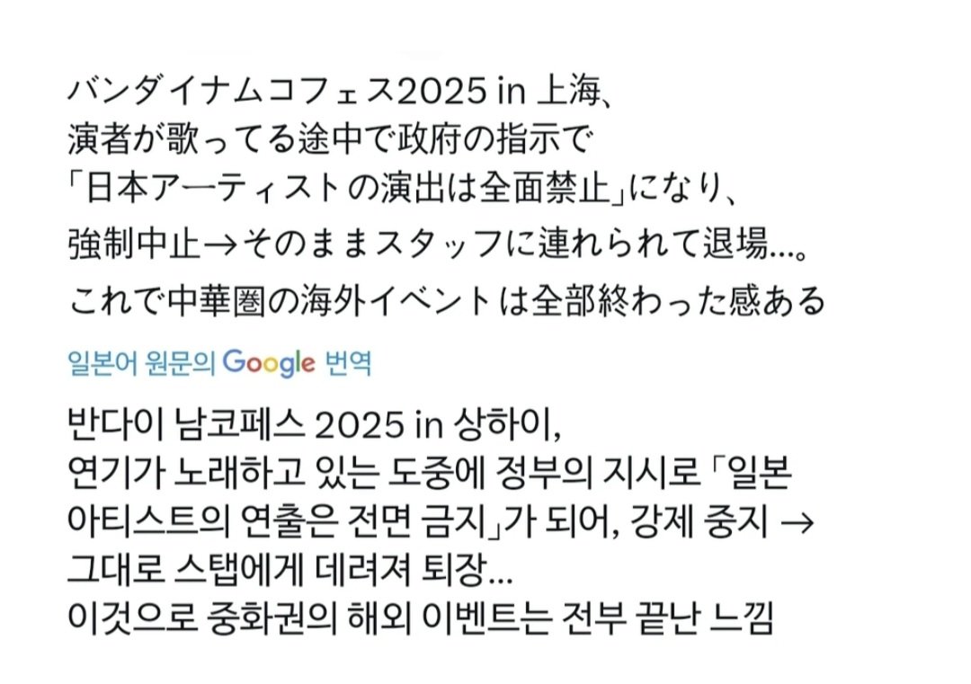 일본 가수 공연 도중 음악 끄고 중지시킨 중국
