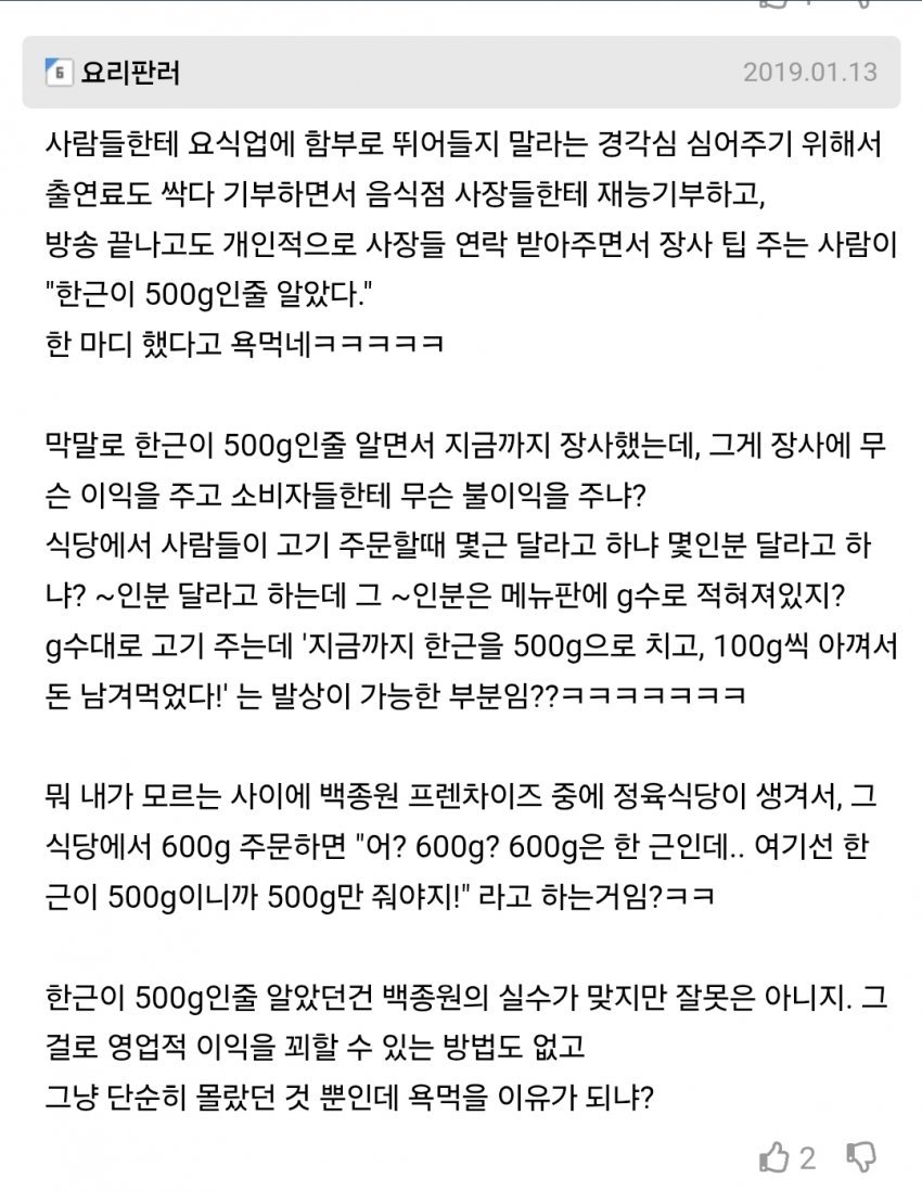 백종원 전성기...1근 500g 놀리면 달리던 댓글