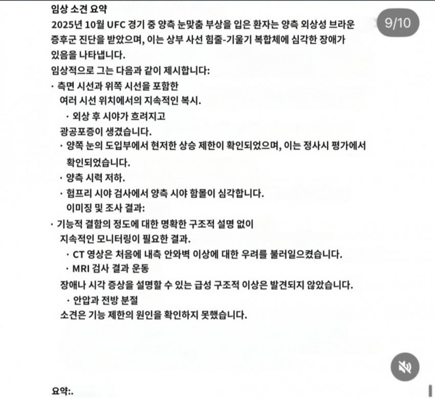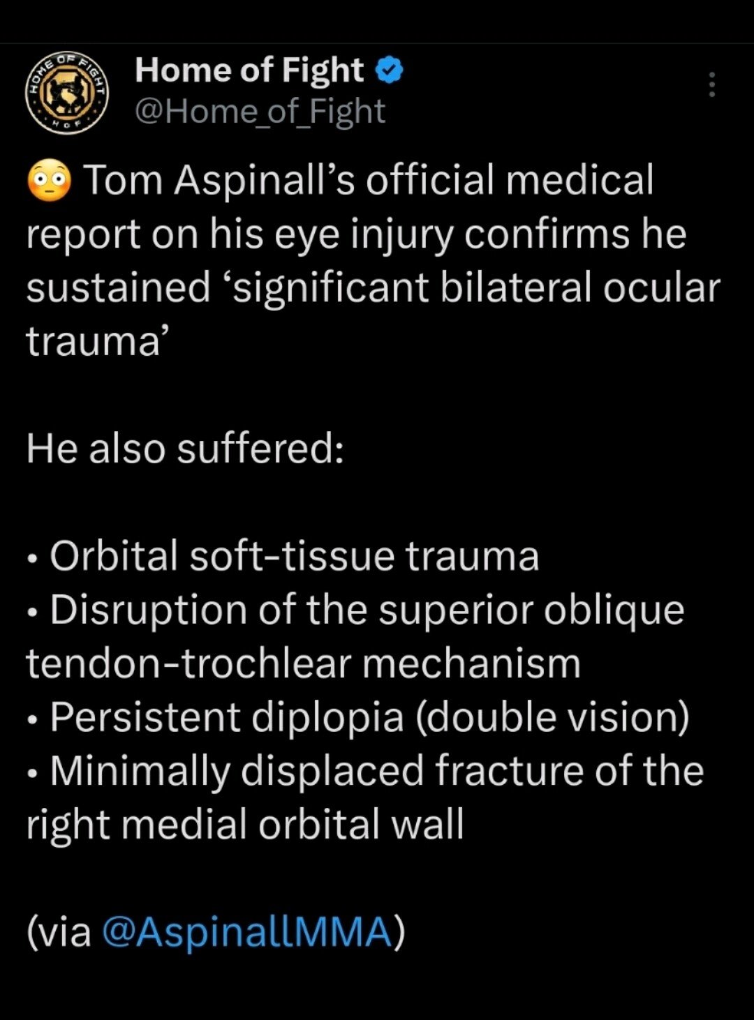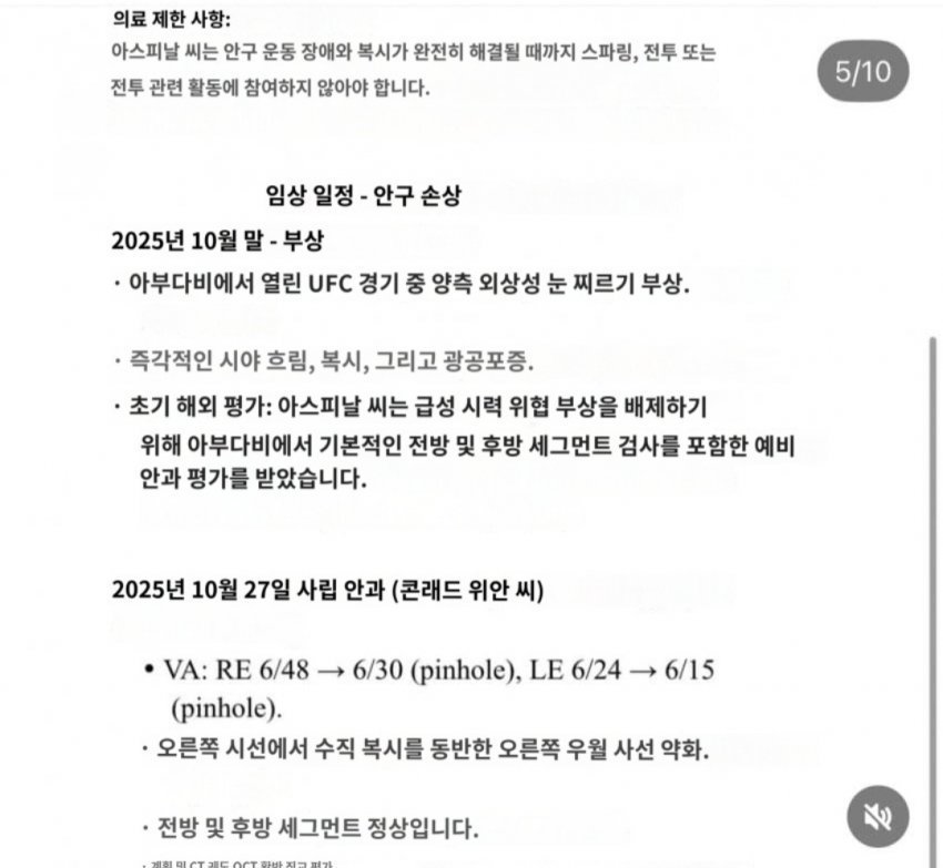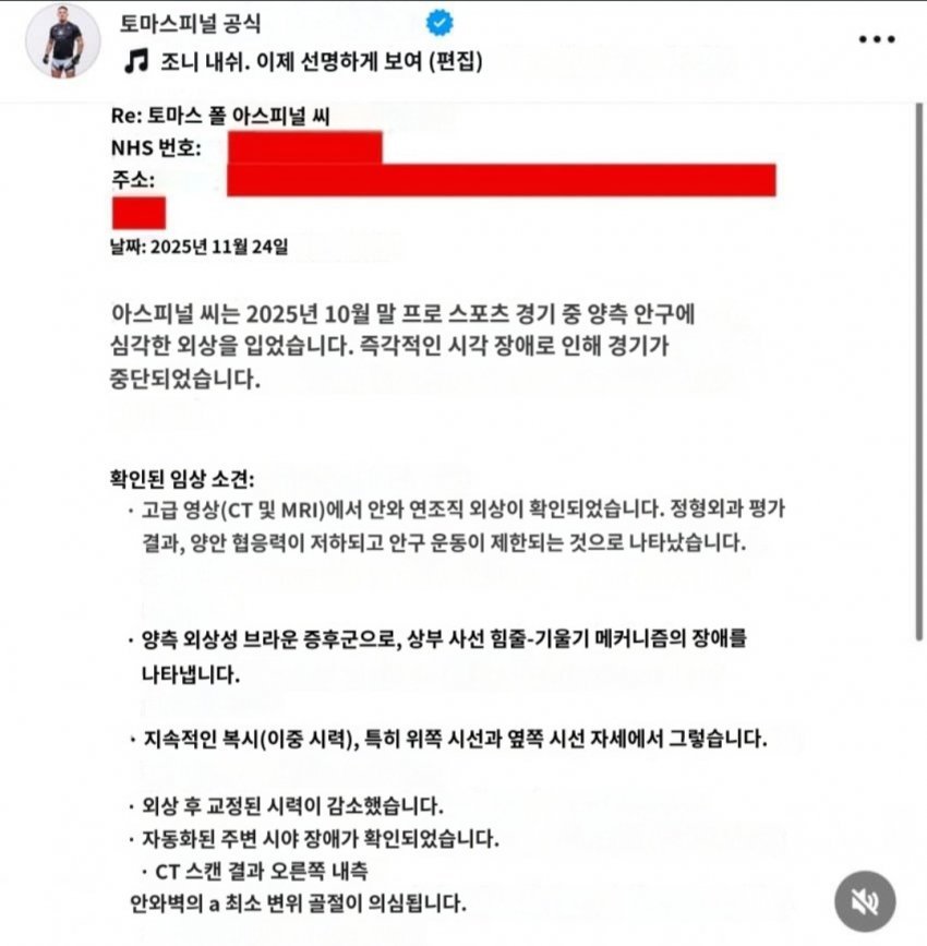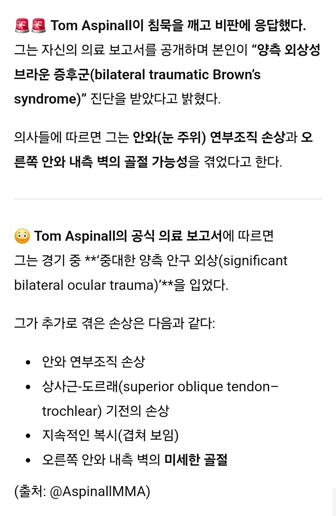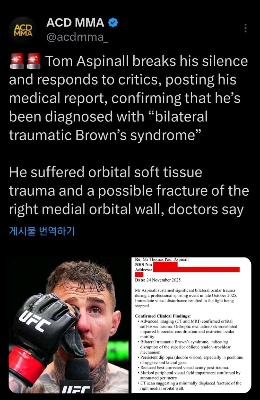 혐주의) UFC 헤비급 챔피언 톰 아스피날...눈 진단서 공개