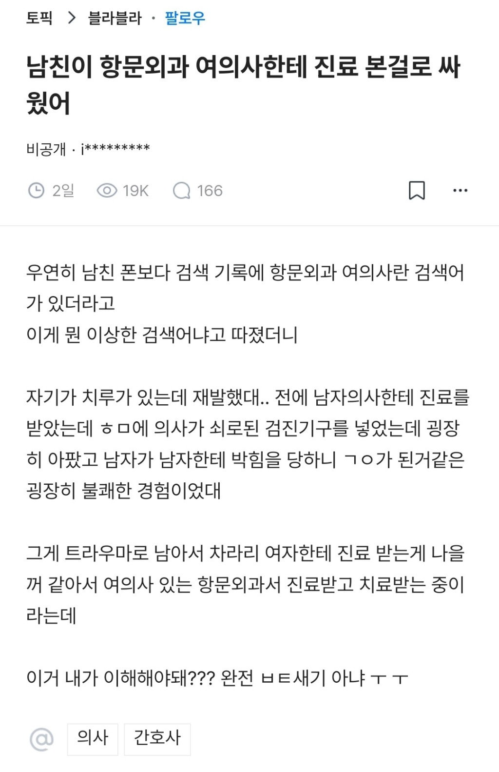 남친이 항문외과 여의사한테 진료 본걸로 싸웠어