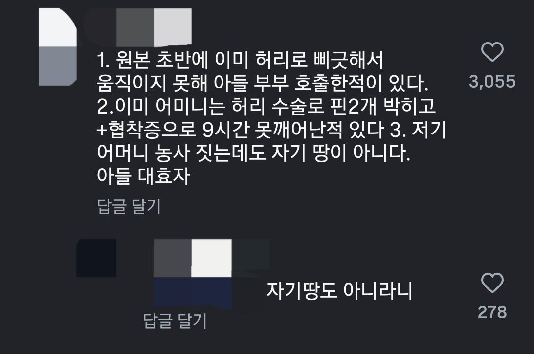 +저 와중에 다른 밭에 나가서 일하다 허리통증때문에 주저앉고 아들 몰래 며느리 불러서 일 시킴
