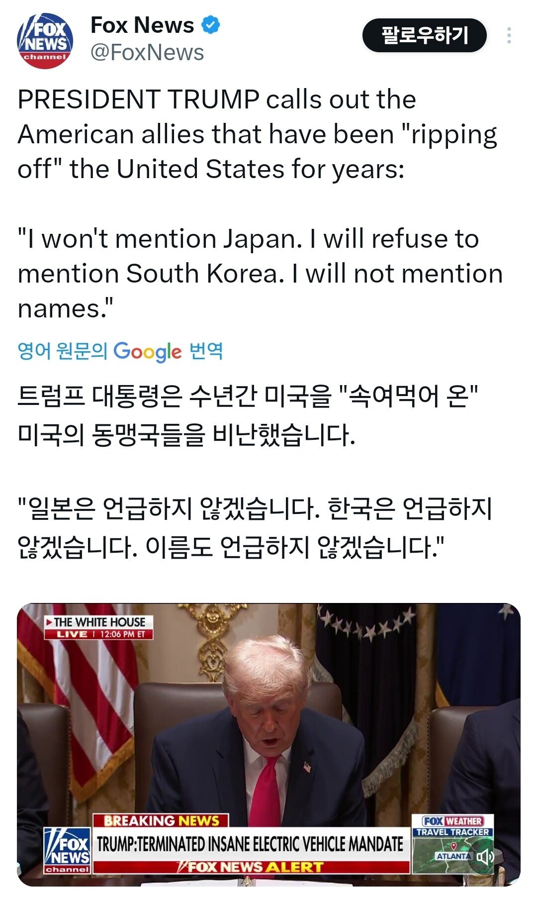 "수년간 미국을 착취해 온 동맹들이 있다. 그게 일본이라고는 말하지 않겠다. 그게 한국이라고는 말하지 않겠다. 그게 누구라고는 말하지 않겠다."