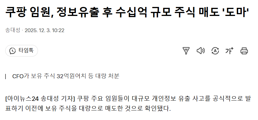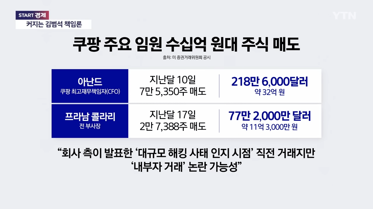 쿠팡 사고 발표전, 쿠팡 임원 주식 대량 매도