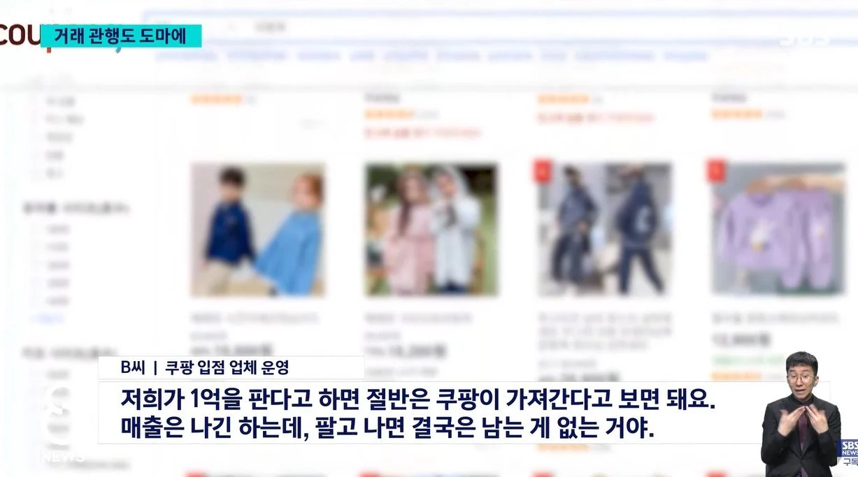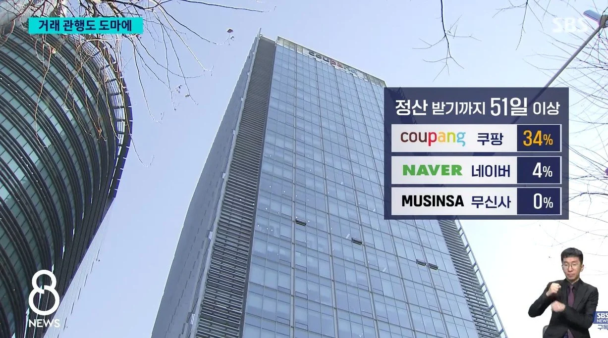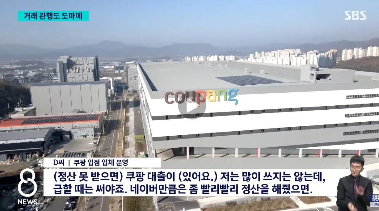 쿠팡은 타업체에 비해 고액의 홍보비와 수익배분률을 뜯어가고, 정산을 일부러 늦게 해주기 위해 타 업계에서는 쓰지 않는 50일짜리 어음을 발행해서 지급하며, 그동안 자금난에 허덕이는 업체에게 고리의 대출(이자율 18.9%)을 해주면서 이자까지 받아냄.