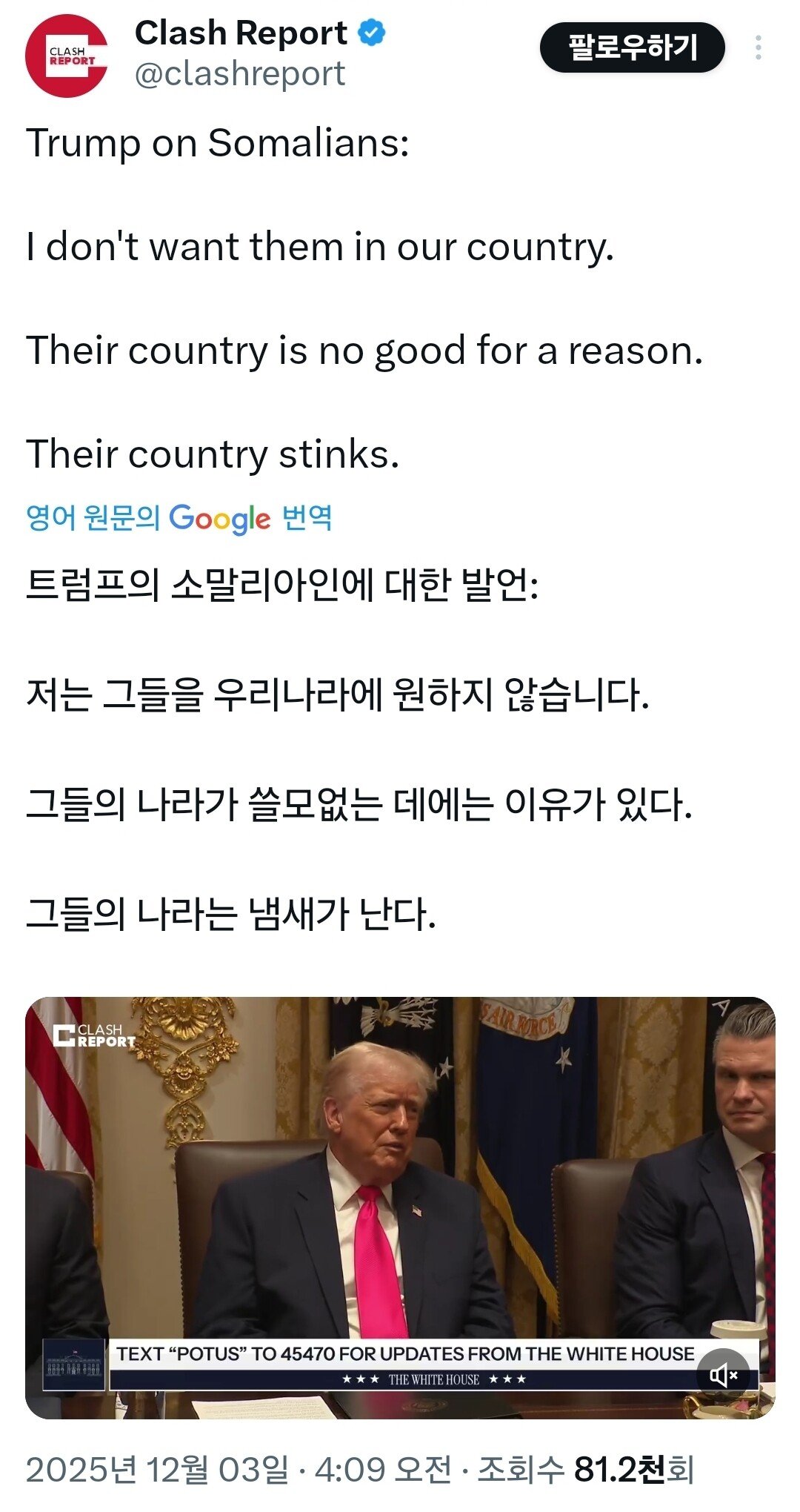 오늘자 트럼프 소말리아 비하 발언 ㄷㄷㄷ