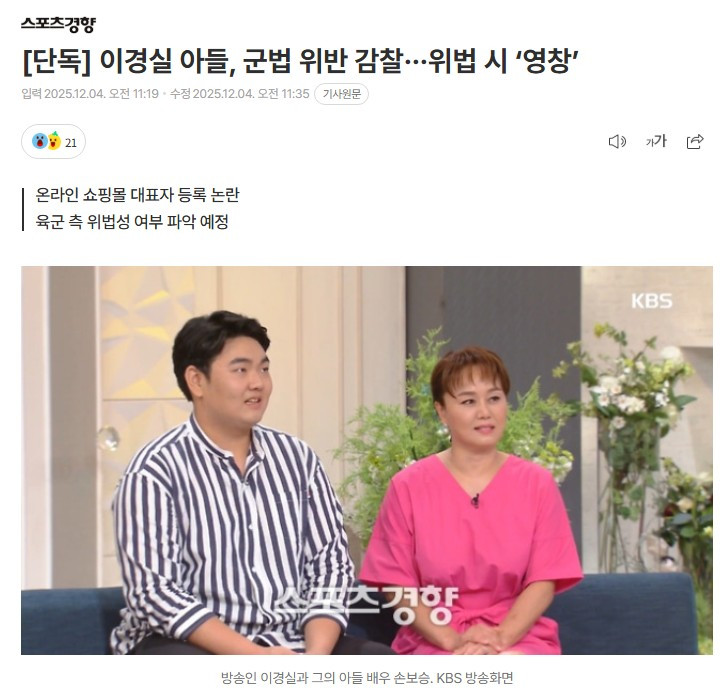 이경실 아들, 군법 위반 감찰···위법 시 ‘영창’