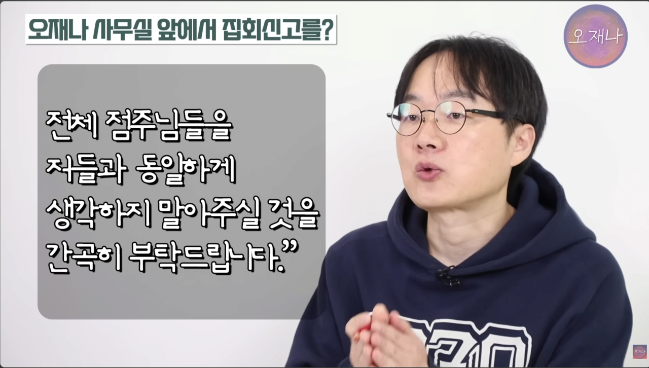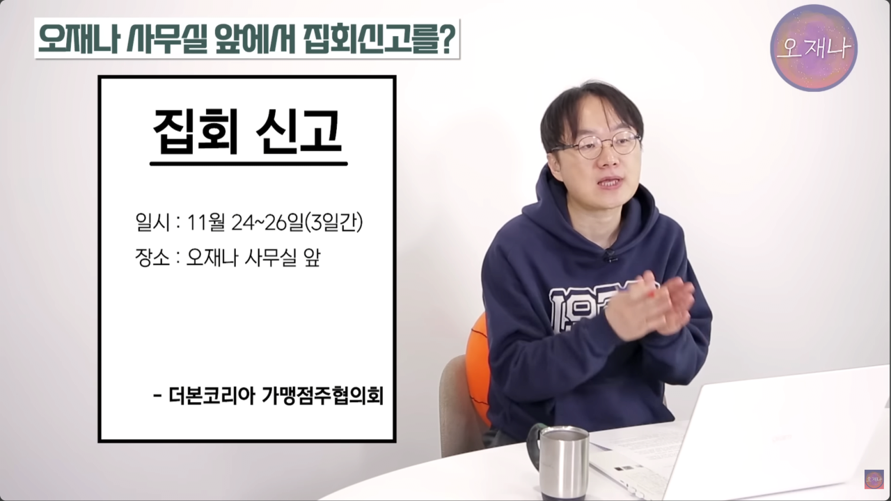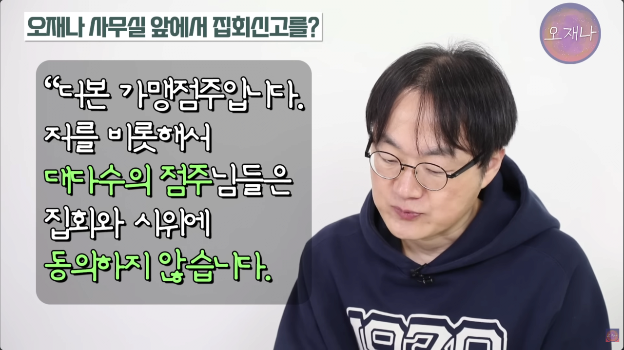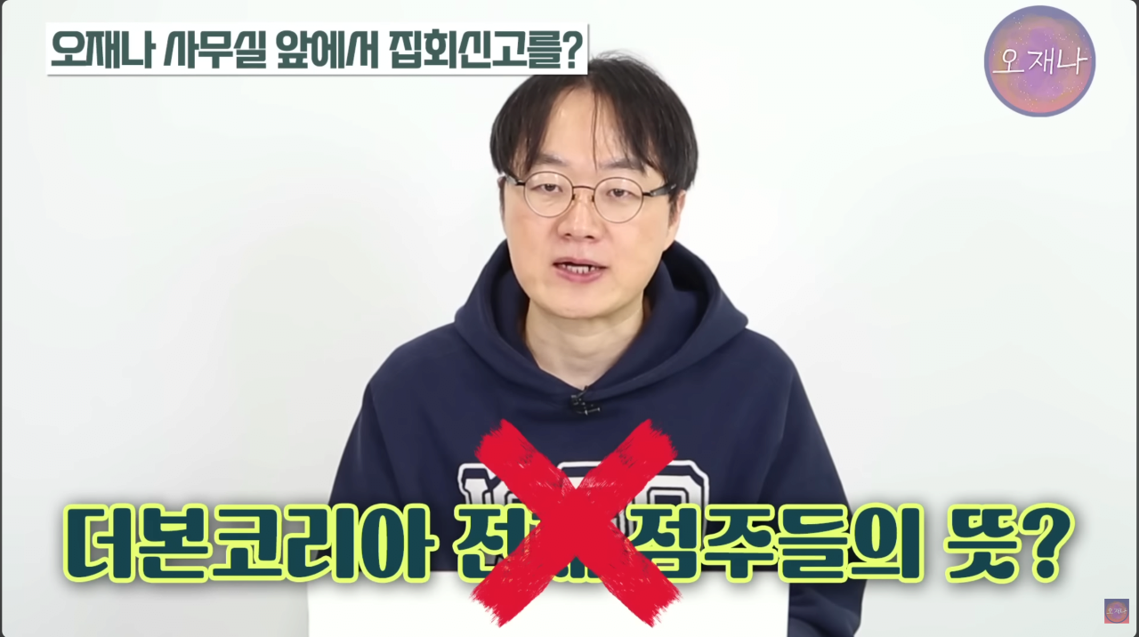 얼마전에 점주들이라면서 더본 코리아 앞도 아니고 오재나 채널 사무실 앞에서 집회 신고 하고