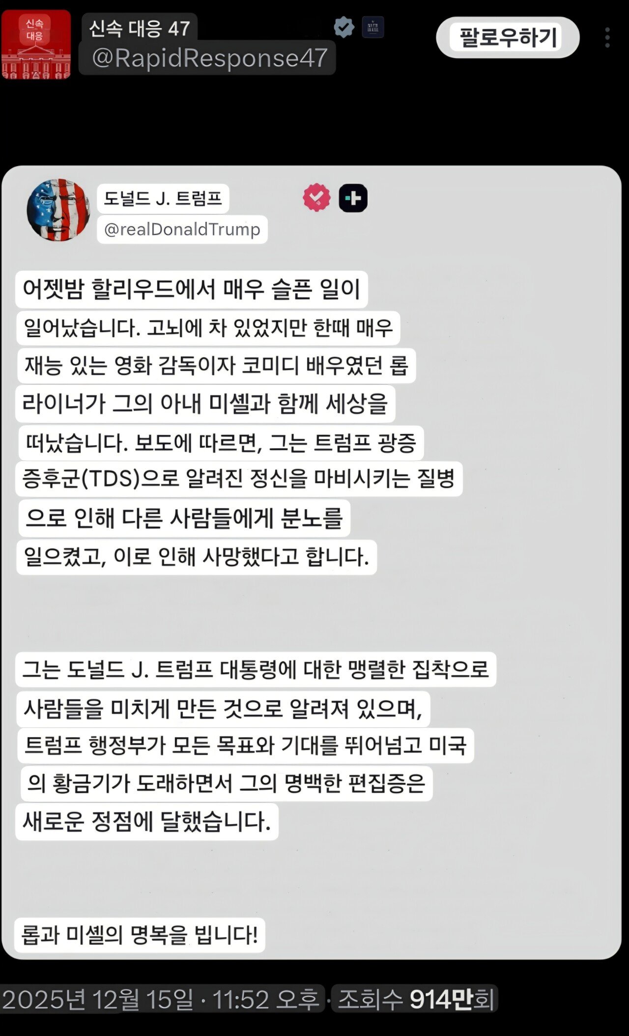 오늘자 자기 sns에 고인을 조롱 하는 글을 올린 트럼프