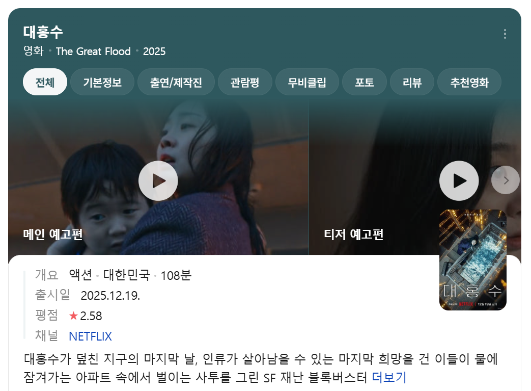 오늘 올라온 넷플 영화 "대홍수" 평점 근황