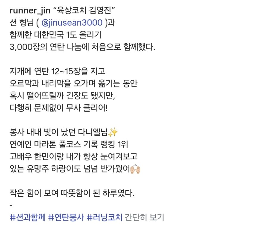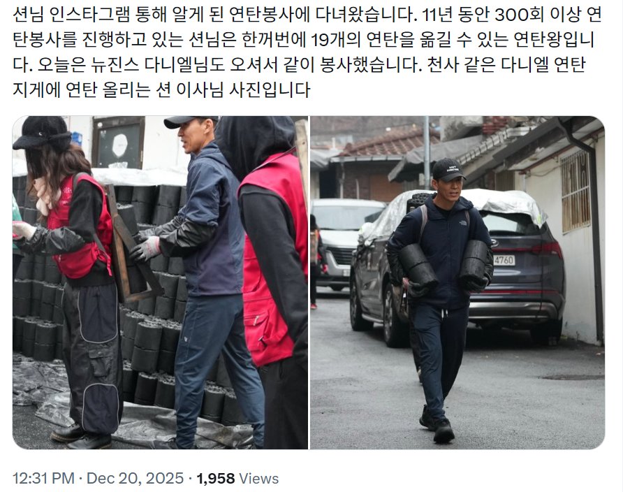 션이 매년 겨울마다 연탄 난방 어르신들 집을 대상으로 하고 있는 "대한민국 1도 올리기"