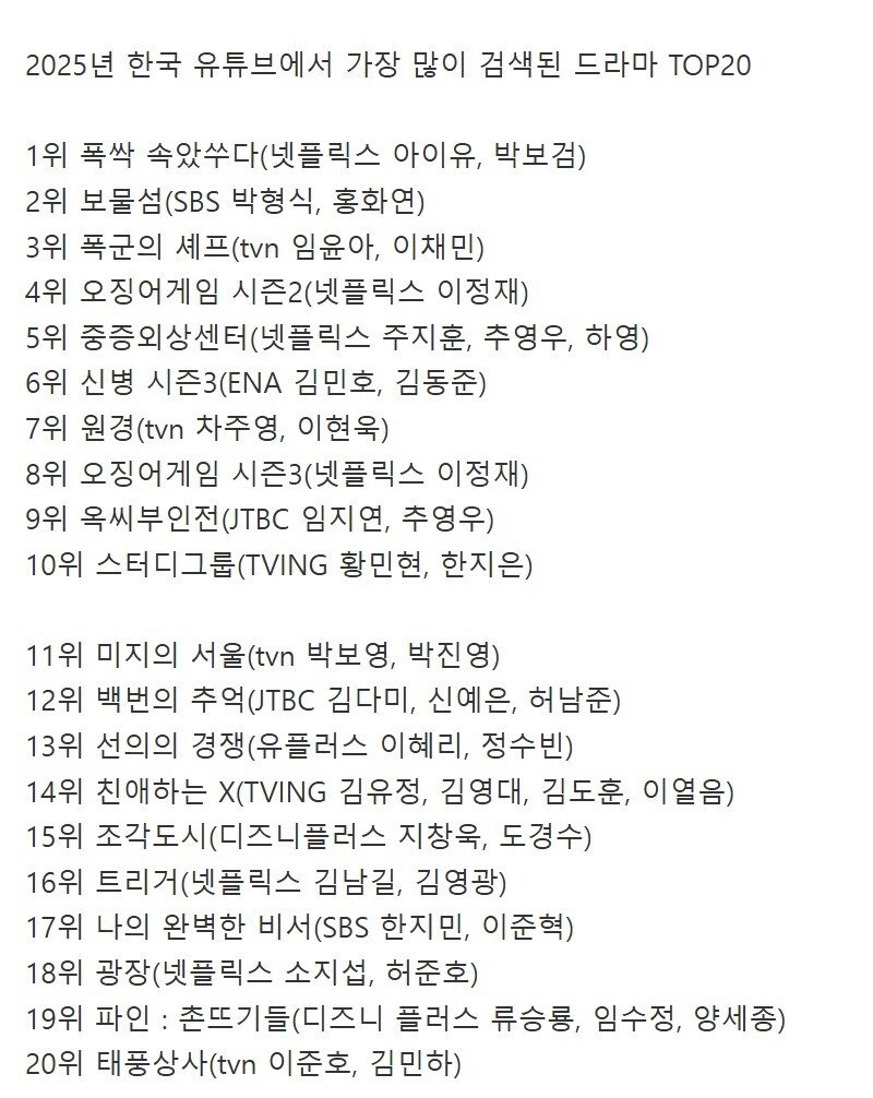 2025년 한국에서 가장 많이 검색된 드라마 순위