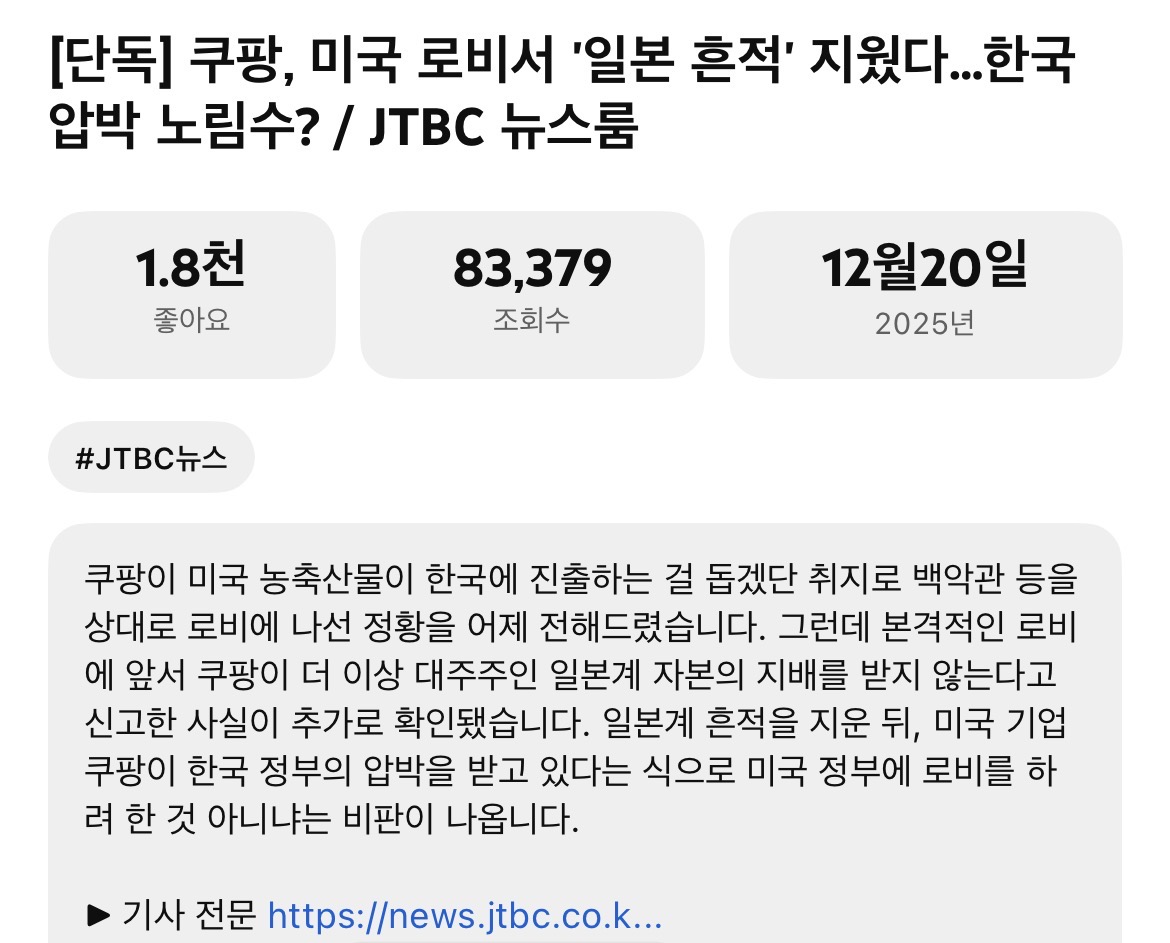 일본계 대주주에 대한 '선 긋기'는 미 정치권에 쿠팡이 '순수 미국 기업'이란 이미지를 심어주고, 결과적으로 "한국이 미국 기업을 압박한다"는 프레임으로 이어질 수 있습니다.