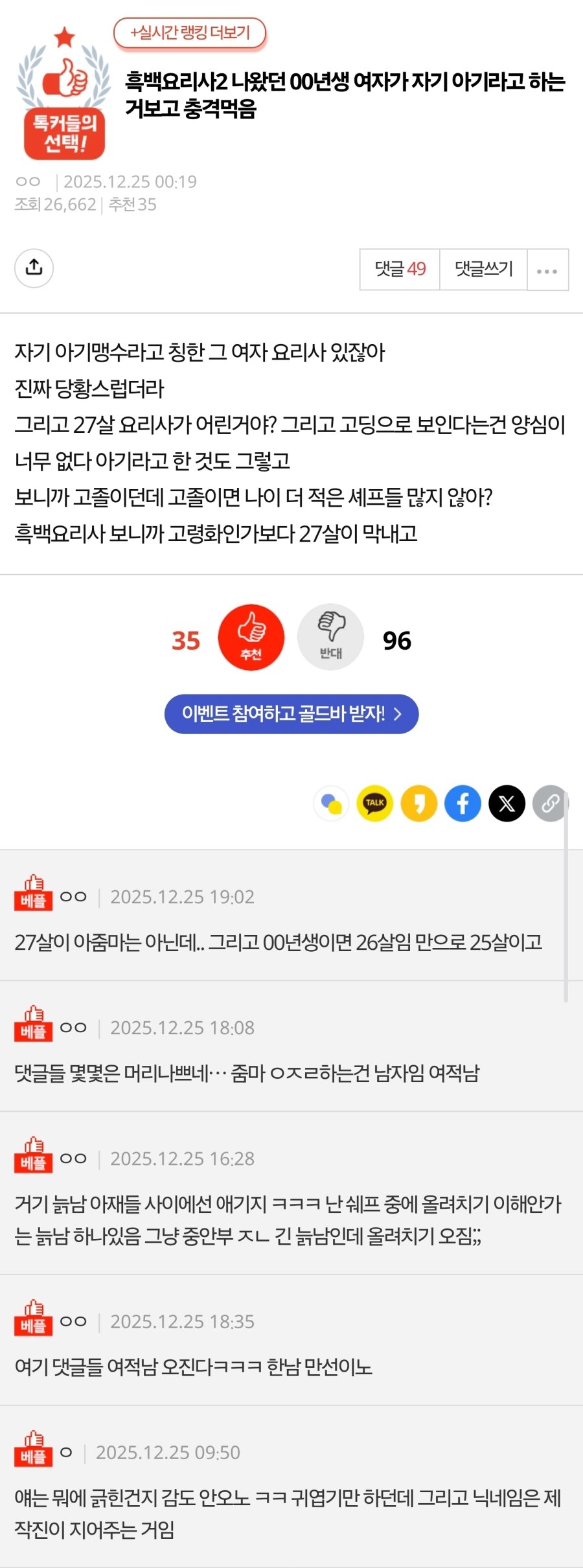 네이트판에서 대세 인증서 받은 흑백요리사2 아기맹수