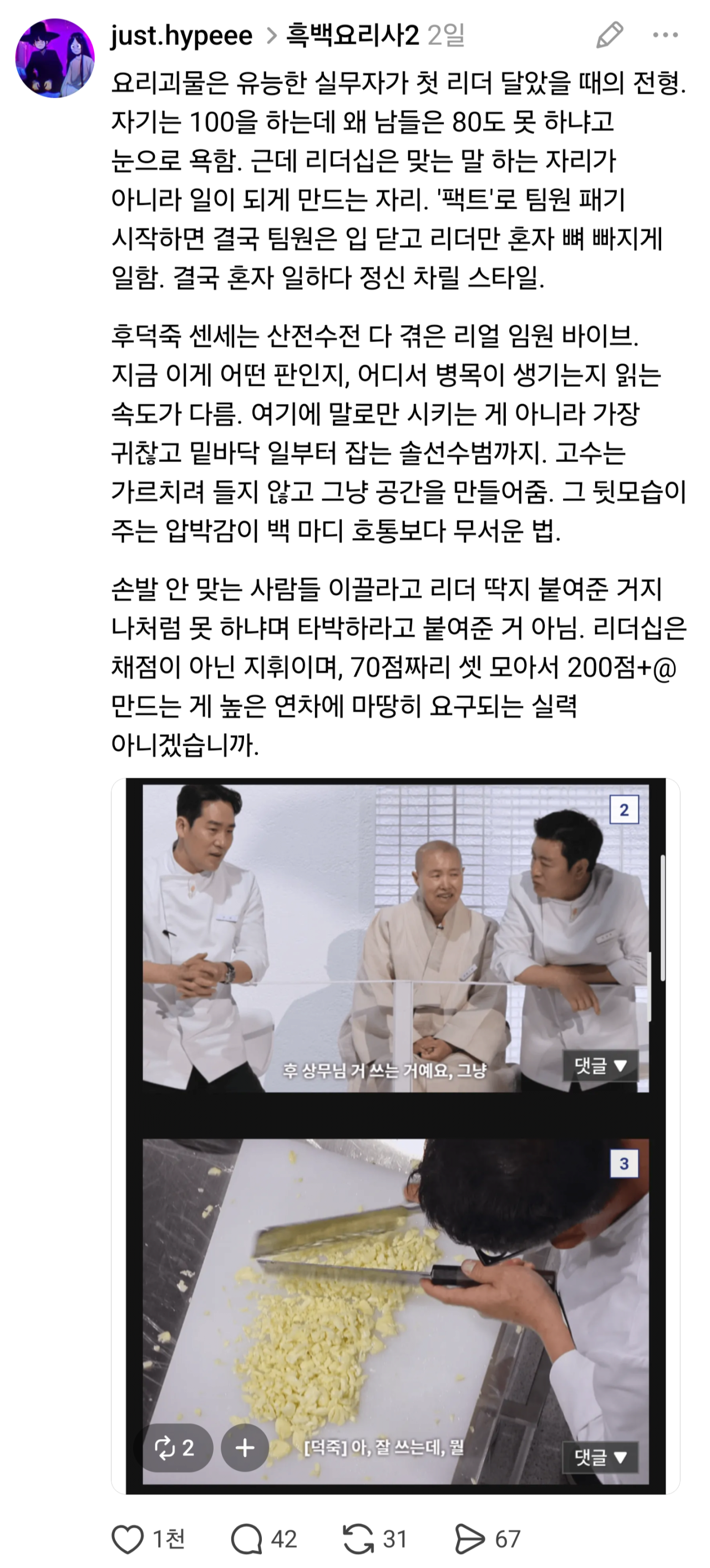 흑백2) 쓰레드에서 좋아요 1천개 받은 요리괴물 비평