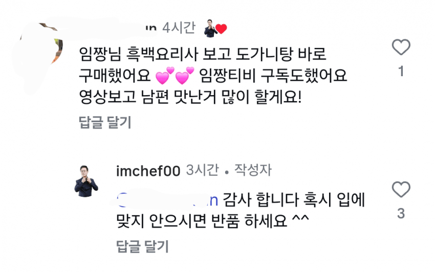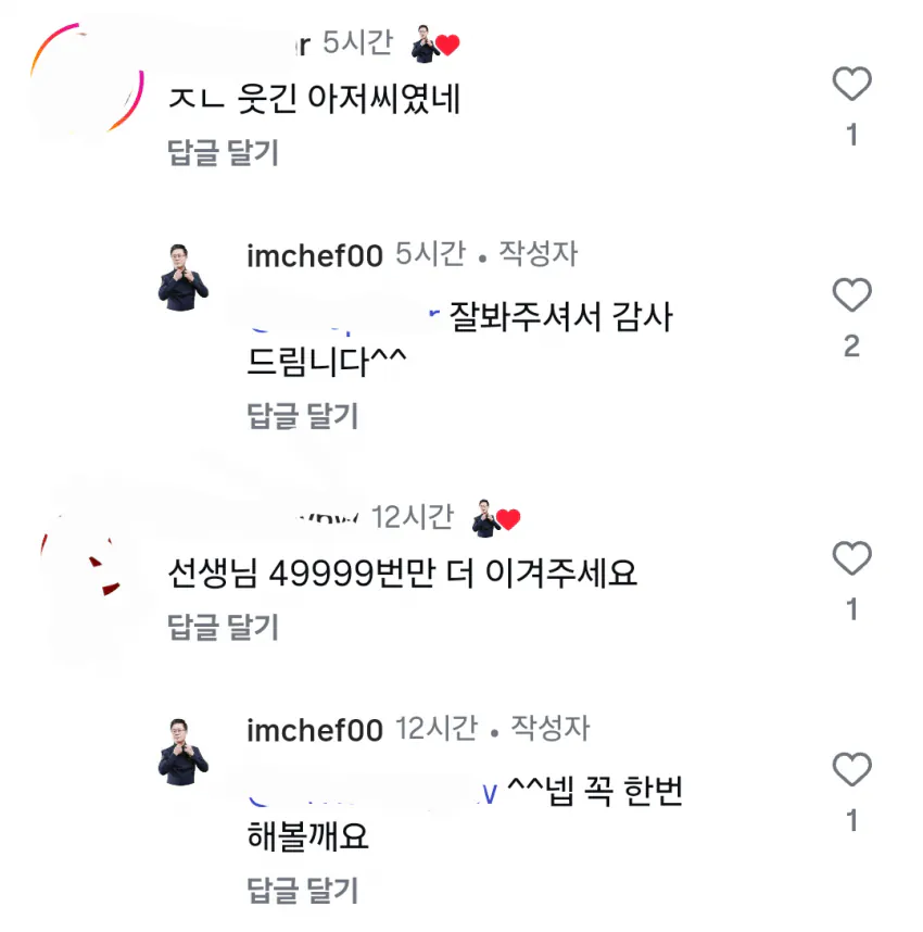 임성근 쉐프 유튜브에 1등으로 댓글을 달면 가끔 임성근 아저씨가 보이스리플로 감사하다고 해준다.