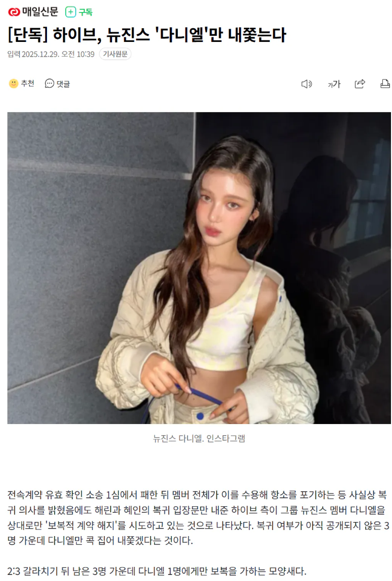 하이브, 뉴진스 "다니엘"만 내쫓는다
