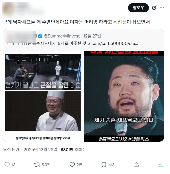 드디어 흑백요리사2 꼬투리 잡은 꼴페미들