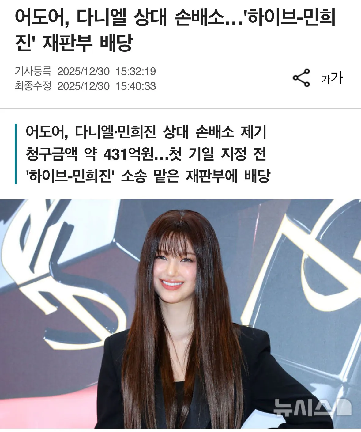 어도어, 다니엘 상대 손배소 청구액 431억원