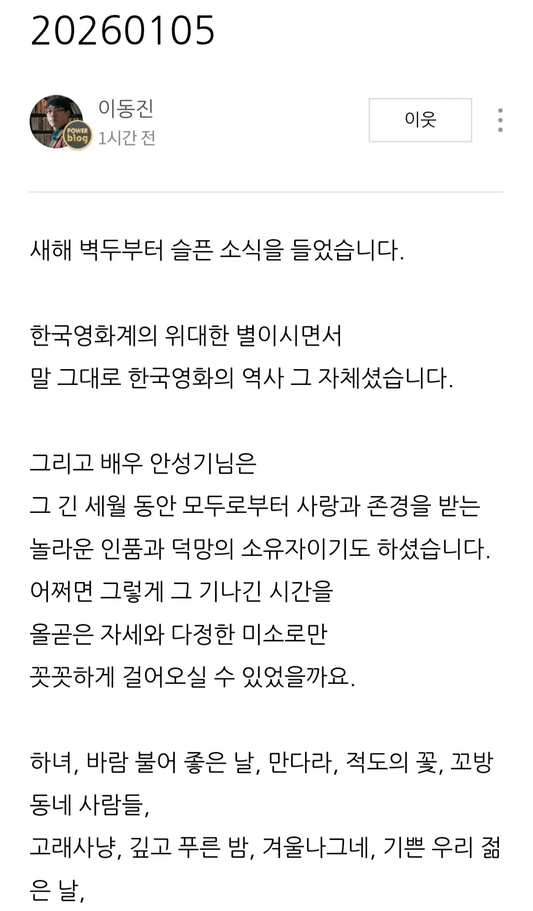 이동진 평론가의 배우 안성기 추모글 댓글 0 조회 549 2026-01-05 14:17 가비슈포댄서 Lv.12 게시글 보기 총 게시글: 1,303개 총 댓글: 0개 가비슈포댄서님의 다른 글 26.01.07 흑백요리사2 이번에 진짜 잘한거 26.01.07 최강록 마음에 대못 박고 온 썰 26.01.07 드라우닝 원곡자 우즈가 생각하는 제일 좋았던 커버 26.01.07 안성재는 아직 하수인 이유