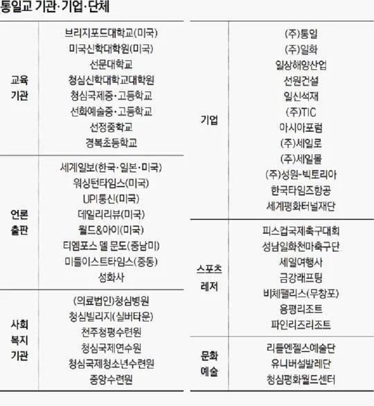 통일교가 소유하고 있는 기관과 기업 및 단체들