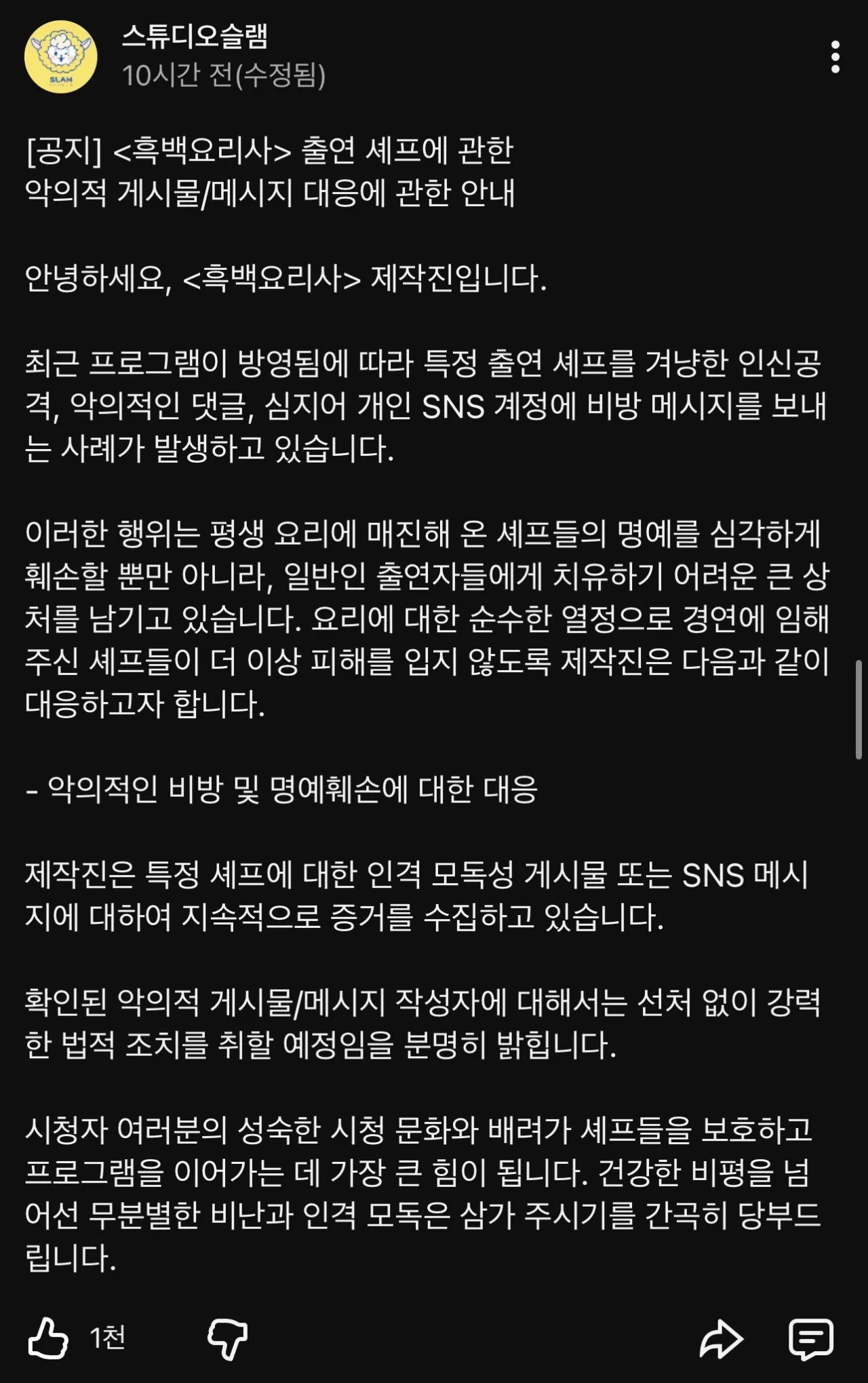 안성재 화교몰이 등 출연진 비방에 결국 법적조치 선언