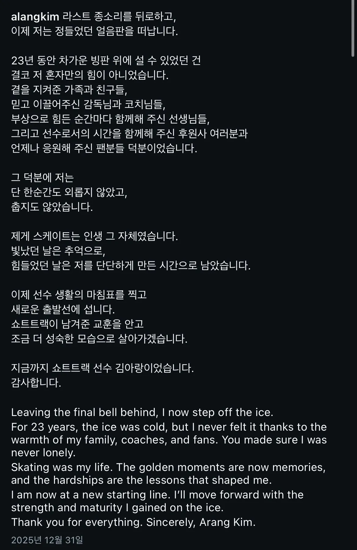 쇼트트랙 선수 김아랑 은퇴
