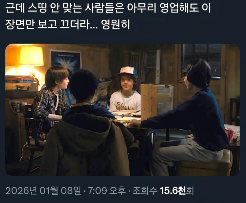 기묘한이야기에서 사람들이 하차하는 부분 댓글 0 조회 593 2026-01-09 20:27 강승 Lv.11 게시글 보기 총 게시글: 1,392개 총 댓글: 0개 시즌1이 호불호 갈려서 초반부 못 넘기고 하차 하는 사람들 많음 근데 시즌1 넘기고부터 꿀잼 강승님의 다른 글 26.01.10 아이브 안유진이 크긴 크네요 26.01.10 강레오의 은밀한 취미 해명 26.01.10 출연 세번째라 예능이 많이 편해진 고윤정 26.01.10 한국의 소금빵 근황