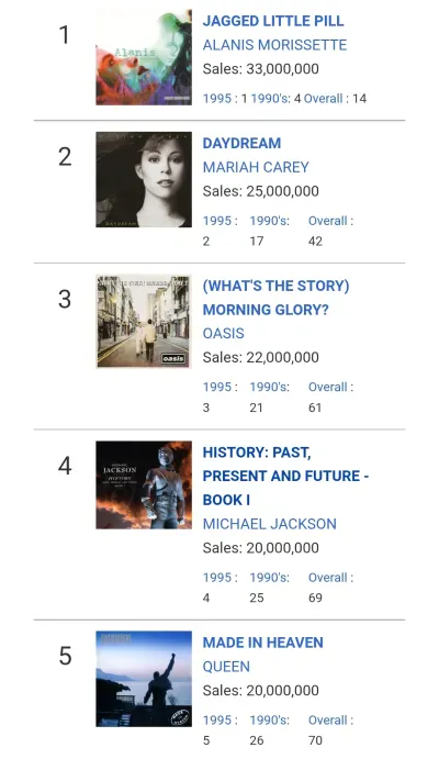 1995년 전세계 앨범 판매량 3위 찍었을때 라인업.