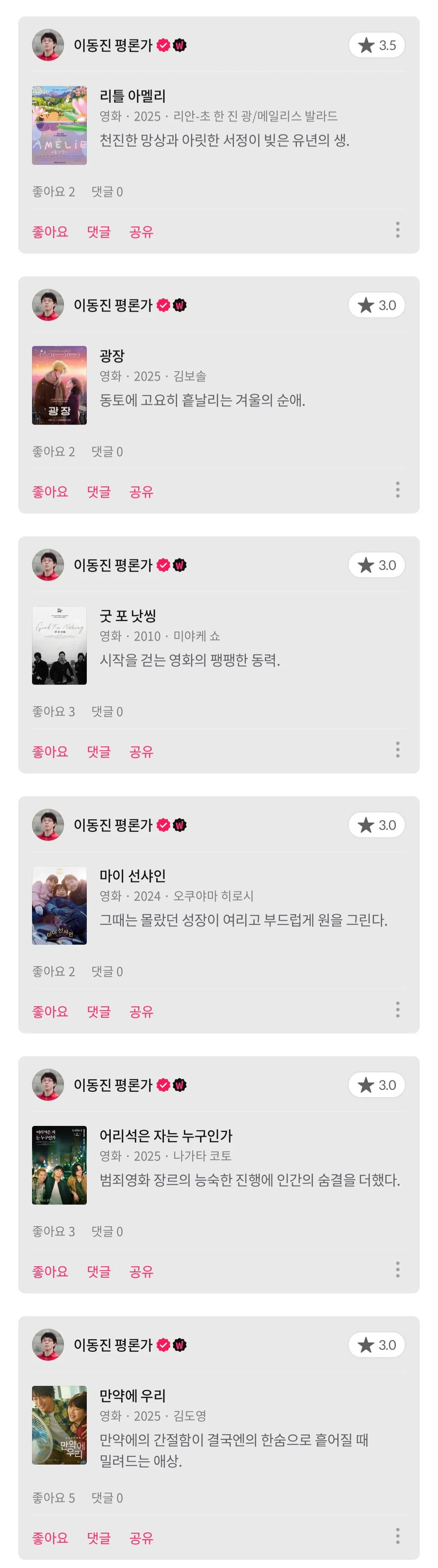 이동진 평론가 새로 뜬 별점