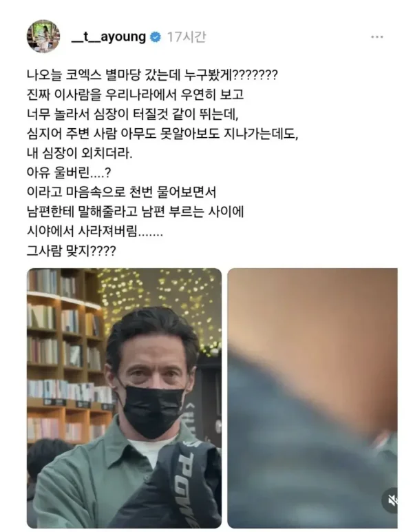 최근 코엑스에서 목격된 "울버린" 휴잭맨 댓글 0 조회 583 2026-01-19 16:39 관셈보살 Lv.3 게시글 보기 총 게시글: 1,463개 총 댓글: 0개 마스크로 가렸는데도 뭔가 멋짐이 관셈보살님의 다른 글 26.01.19 보정 없는 카리나 실물 느낌 체감샷 26.01.19 [공식] 임성근, 아는형님 출연 취소 26.01.19 강도 당하다 옛날 친구 만나버린 상황 26.01.19 임성근 유튜브 댓글 일침 ㄷㄷㄷ