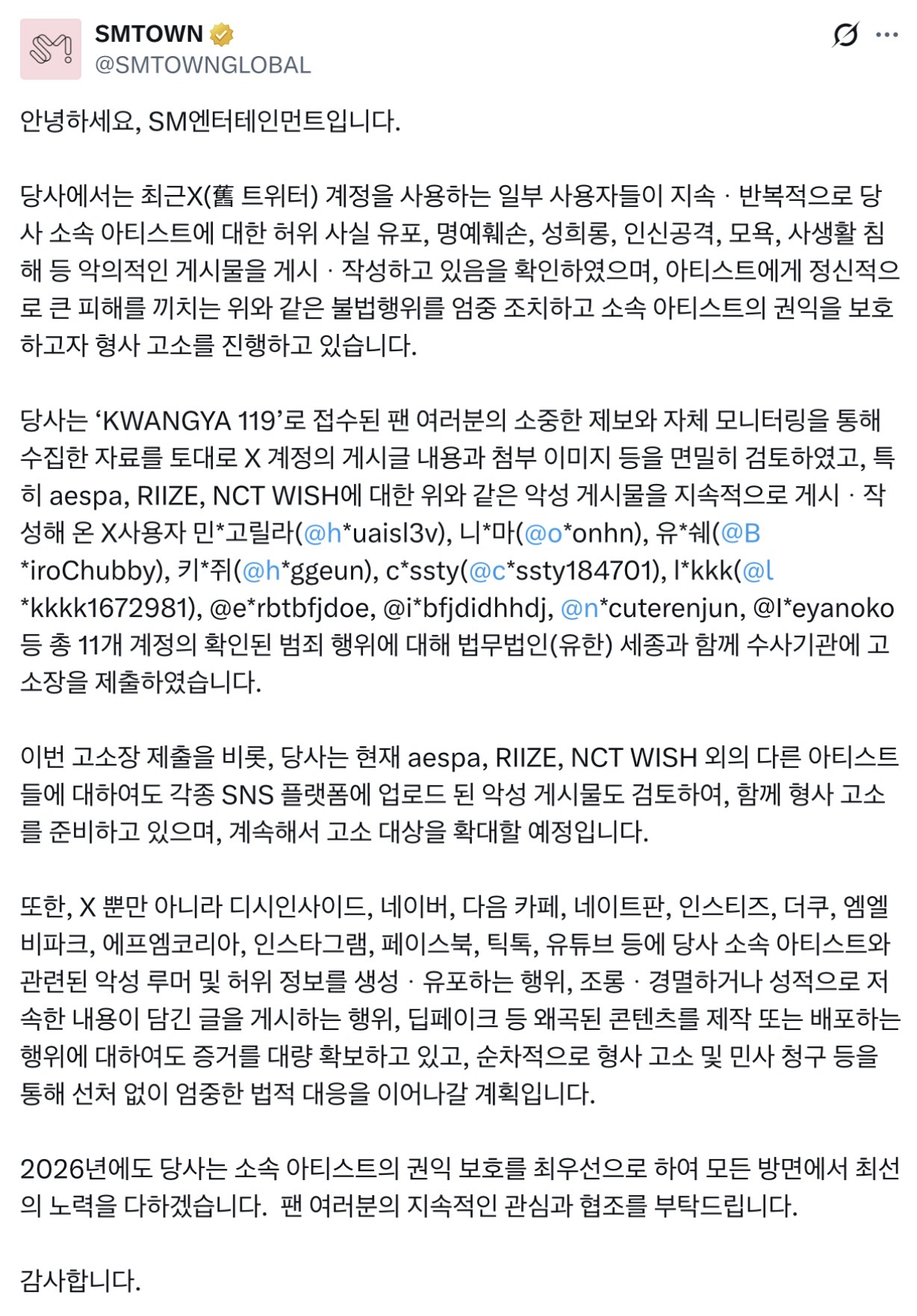 트위터 고소 계정 박제.. SM 고소 공지