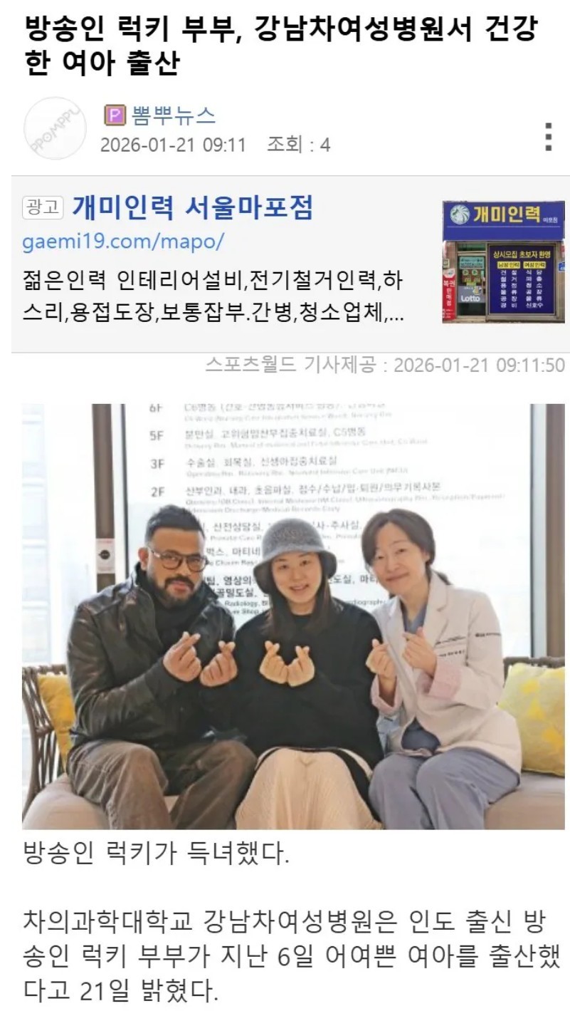방송인 럭키 부부, 건강한 여아 출산