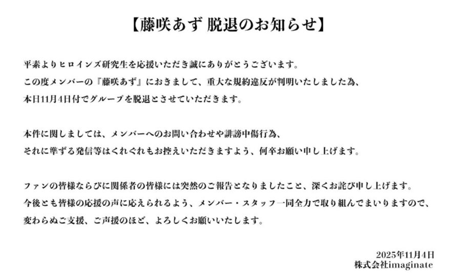 이번에 멤버 후지사키 아즈와 관련하여 중대한 규정 위반이 확인됨에 따라,