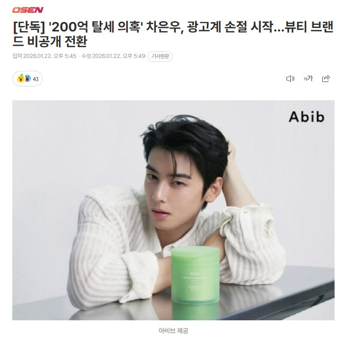 "200억 탈세 의혹" 차은우, 광고계 손절 시작 댓글 0 조회 561 2026-01-22 18:51 가지마라 Lv.3 게시글 보기 총 게시글: 1,514개 총 댓글: 0개 200억 탈세 의혹을 받고 있는 그룹 아스트로 멤버 겸 배우 차은우에 대한 광고계 손절이 시작됐다.22일 OSEN 확인 결과, 스킨케어 브랜드 아비브 측은 유튜브 채널 등에 공개된 차은우의 영상을 비공개로 전환했다. https://m.entertain.naver.com/now/article/109/0005466298 가지마라님의 다른 글 26.01.22 차은우 탈세 의혹이 역대급인 이유 26.01.22 김연경에게 인스타 DM보낸 김연아 26.01.22 입마개를 하기 싫은 개주인 26.01.22 마이클잭슨에게 사과했던 에미넴