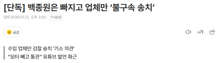 백종원은 빠지고 업체만 ‘불구속 송치’ 댓글 0 조회 577 2026-01-22 18:33 관셈보살 Lv.3 게시글 보기 총 게시글: 1,498개 총 댓글: 0개 더본코리아 대표 겸 요리연구가 백종원이 관세법 위반 혐의는 벗었으나 불법 조리 기구 수입 업체는 검찰에 송치된 것으로 드러났다.관세청 서울세관 특수조사과 특별사법경찰은 22일 백종원과 더본코리아의 관세법 위반 혐의와 관련해 더본코리아가 튀르키예 조리 장비의 수입 절차에 관여한 정황이 발견되지 않아 무혐의 처분을 내렸다. https://m.entertain.naver.com/home/article/144/0001093342 관셈보살님의 다른 글 26.01.22 차은우 탈세 의혹이 역대급인 이유 26.01.22 김연경에게 인스타 DM보낸 김연아 26.01.22 입마개를 하기 싫은 개주인 26.01.22 마이클잭슨에게 사과했던 에미넴