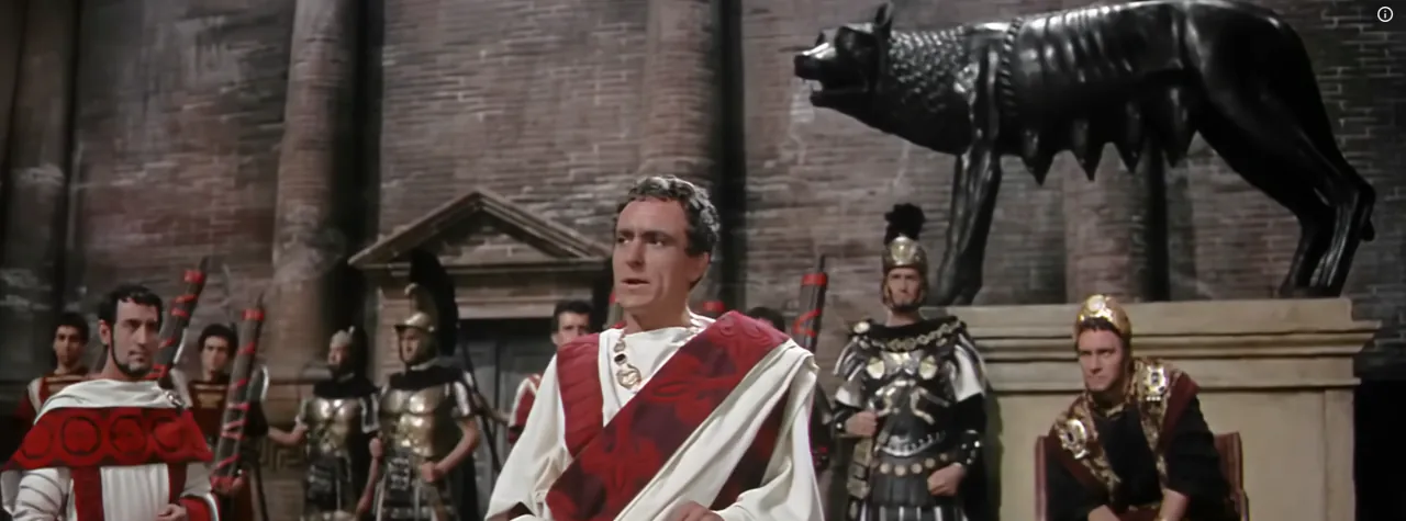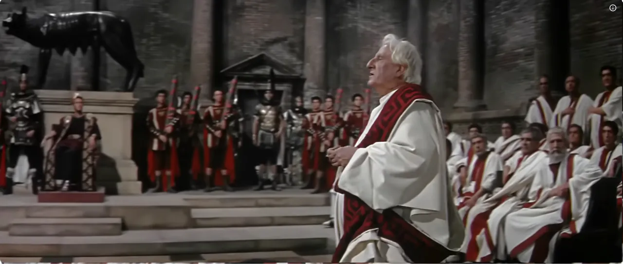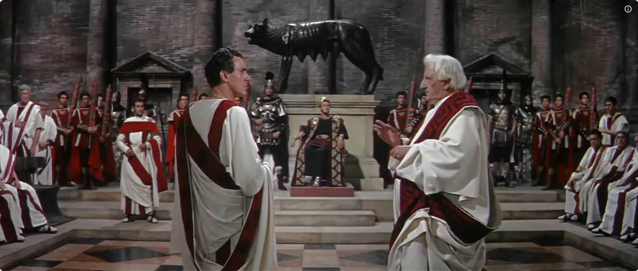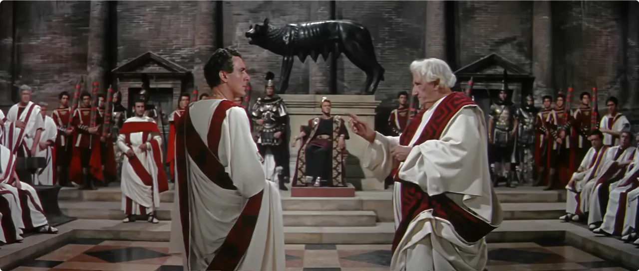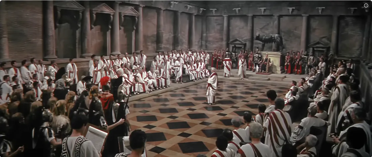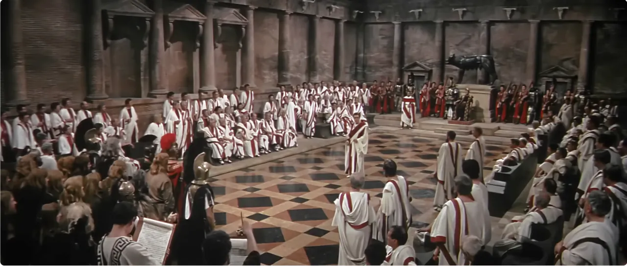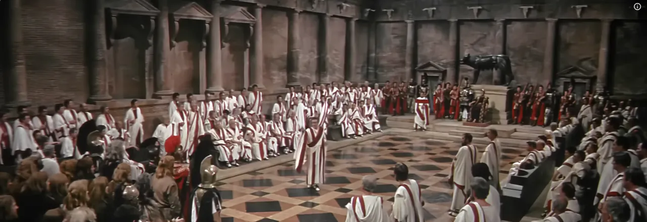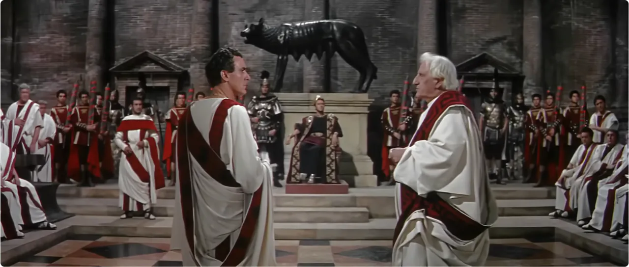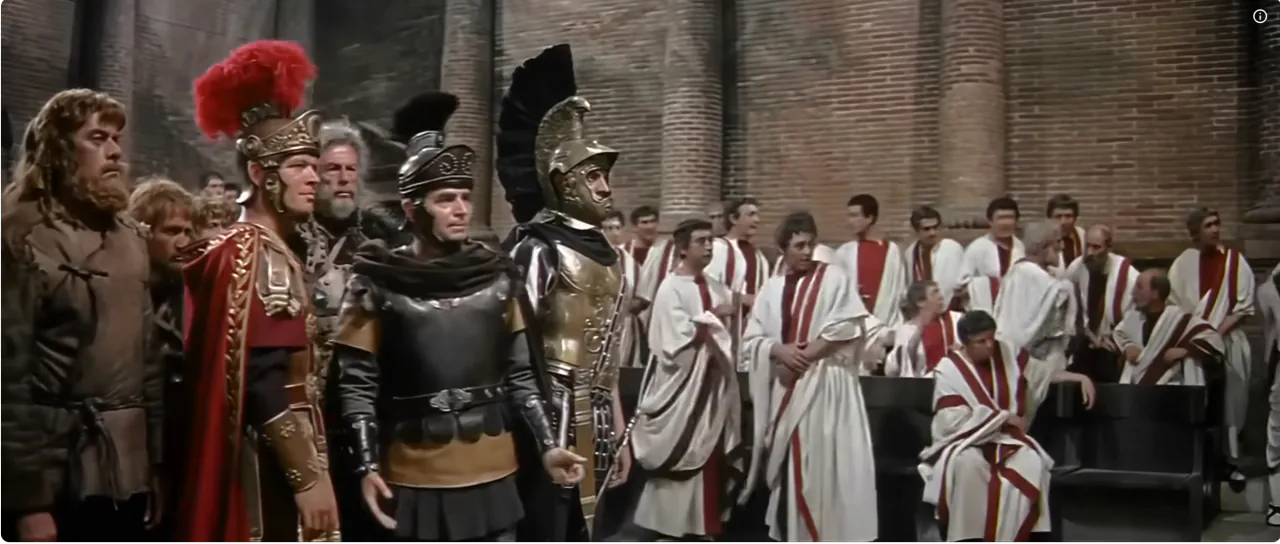 (마르쿠스 아우렐리우스 사후 야만인들에게 시민권을 주는 것 등 제국의 미래에 대해 토론하는 장면인데, 냉전 당시 미국의 상황을 빗댔다고 함)