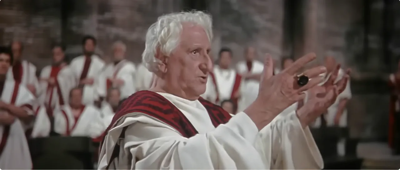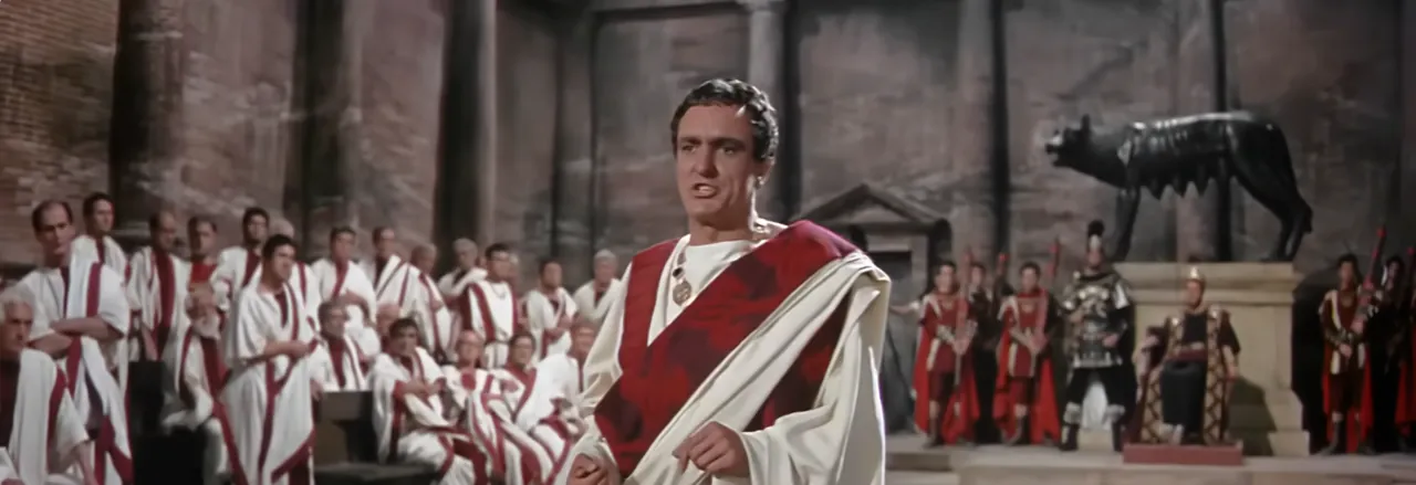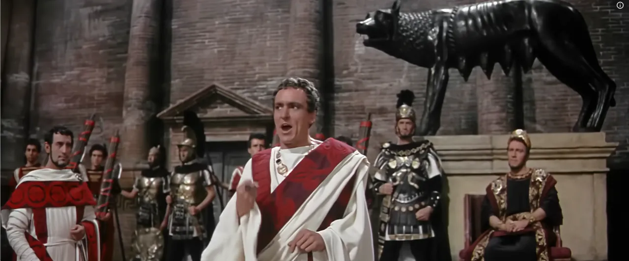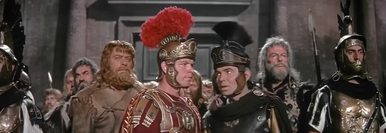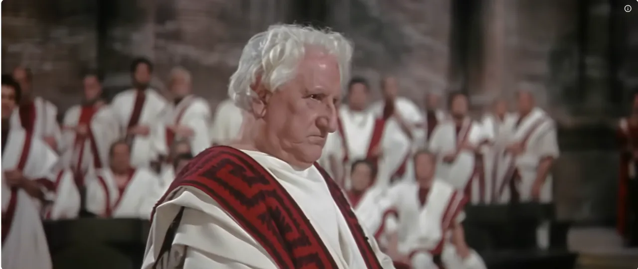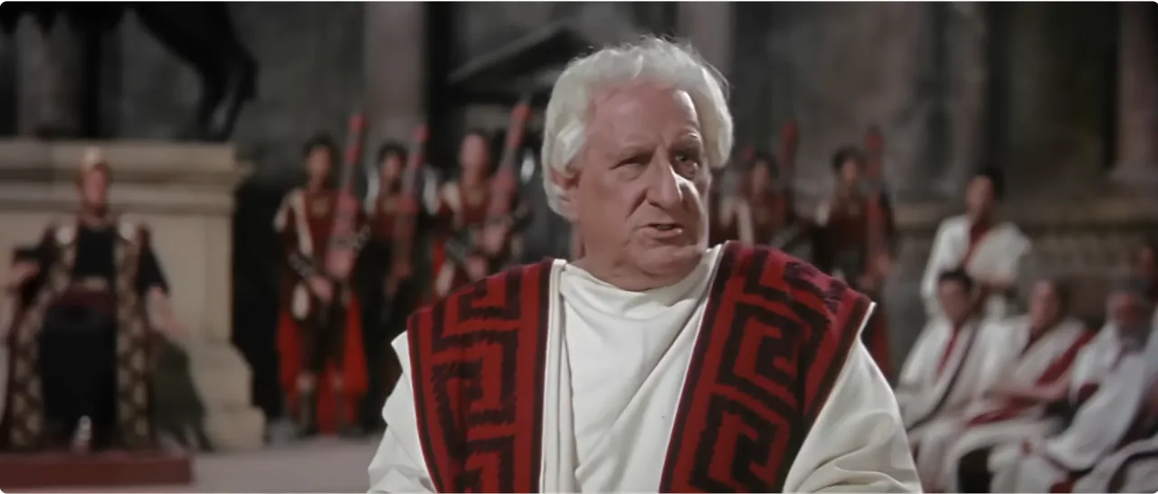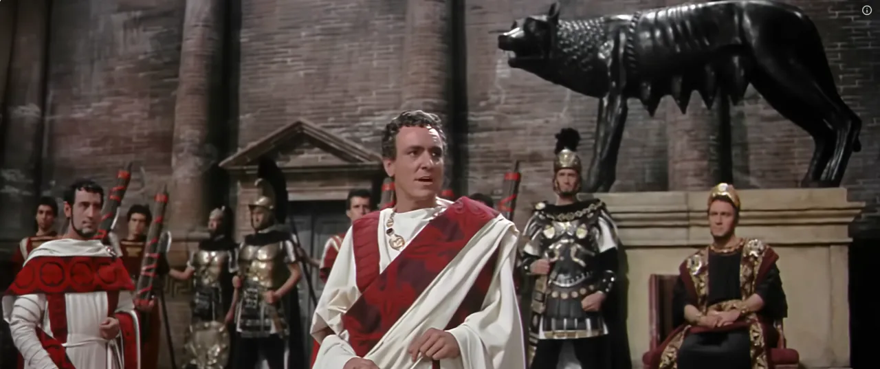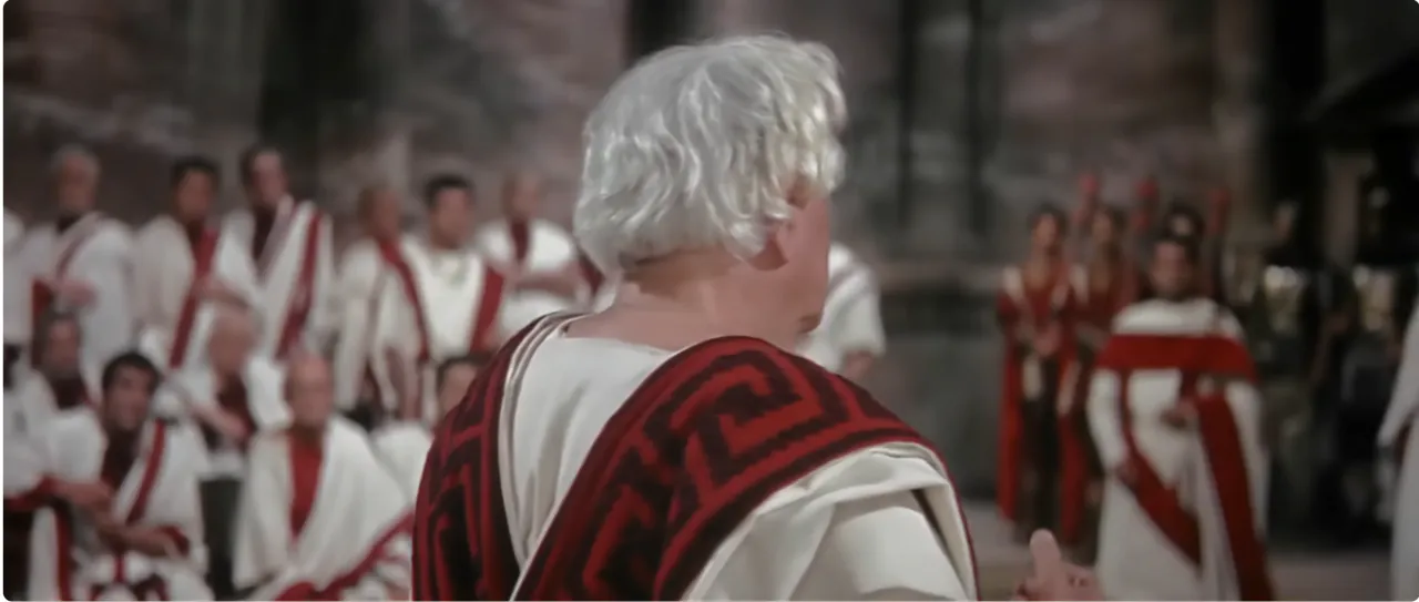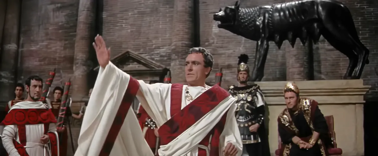 (마르쿠스 아우렐리우스 사후 야만인들에게 시민권을 주는 것 등 제국의 미래에 대해 토론하는 장면인데, 냉전 당시 미국의 상황을 빗댔다고 함)