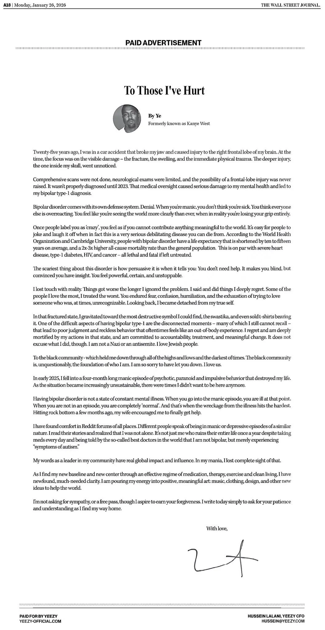 칸예 웨스트, 월스트리트 저널에 사과문 게시