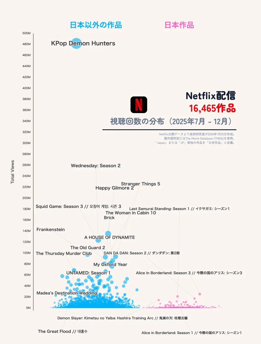 넷플 총 16,465작품 6개월간 전세계 시청횟수 분포도